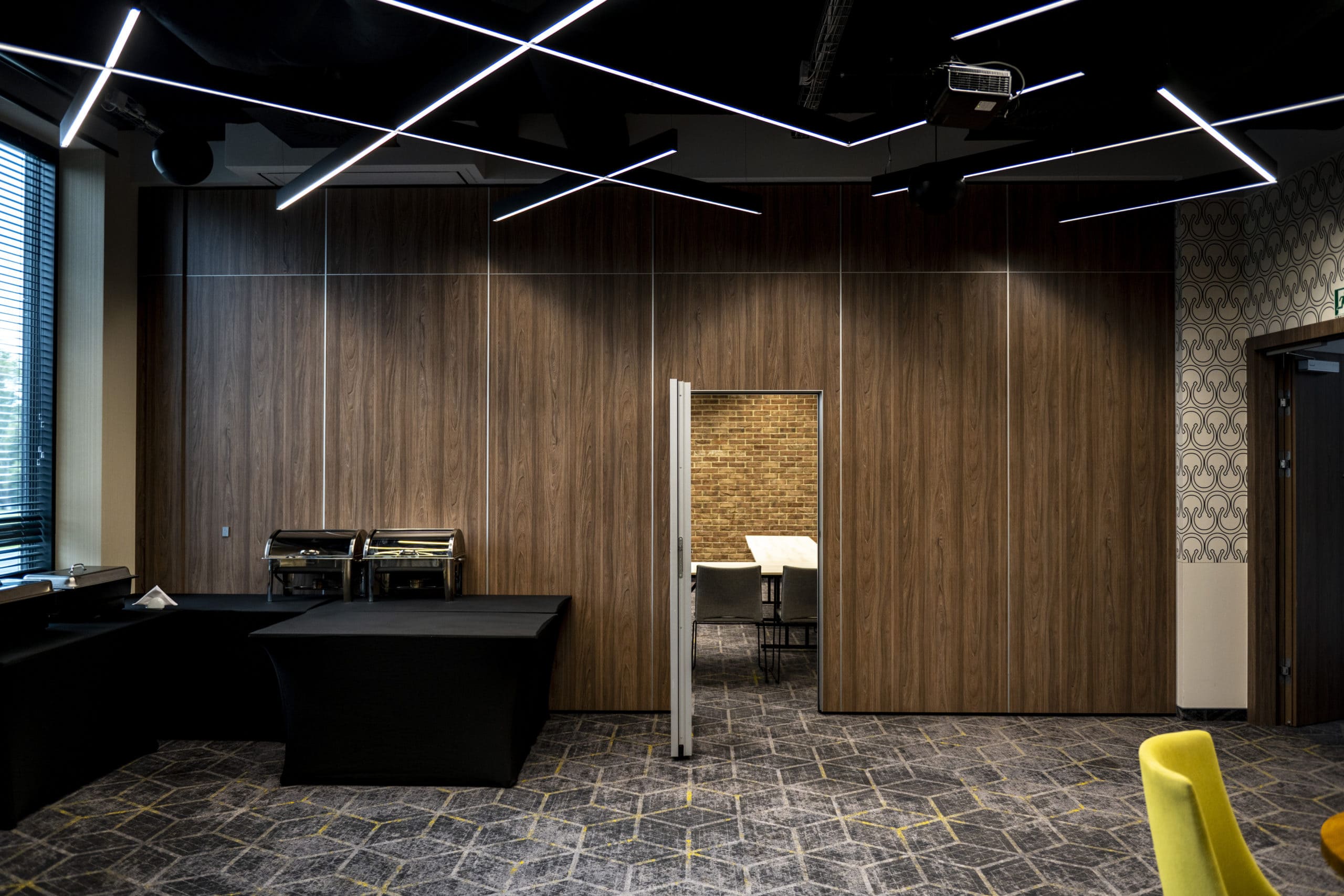 Part of an international hotel network which, as of 2015, operated over 300 establishments of this type. At the Lublin location, we installed six mobile walls, each exceeding 3.00 metres in height. In line with the designer’s vision, some walls were designed with visible side profiles in anodised aluminium and finished with a wood-effect laminate in the Amsterdam Elm (D3193) décor. Other walls were covered with custom-designed patterned wallpaper.