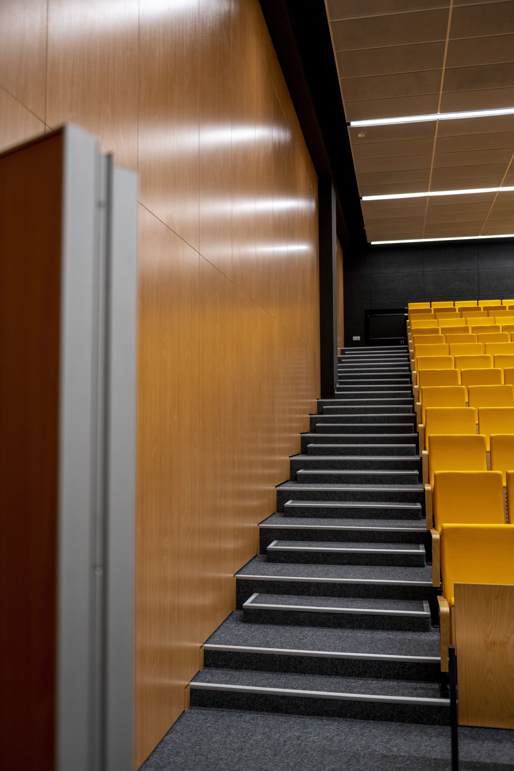 This is another project demonstrating how the technical sophistication of Optimal’s mobile wall can produce spectacular effects. A stepped mobile wall, reaching nearly 6 metres at its highest point is operated semi-automatically. Finished with a beech wood-effect laminate, the wall complements the room’s interior while improving user comfort.